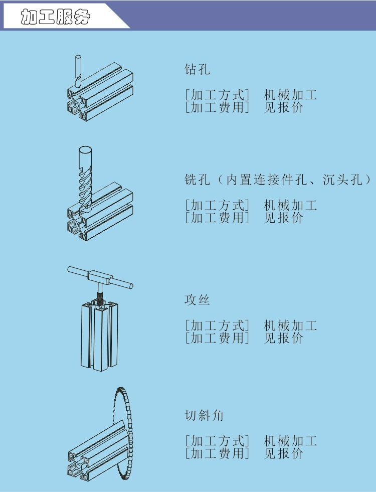 4、所有型材均可以按照图纸进行钻孔、攻螺纹、组装等加工,需要收取相应的费用。