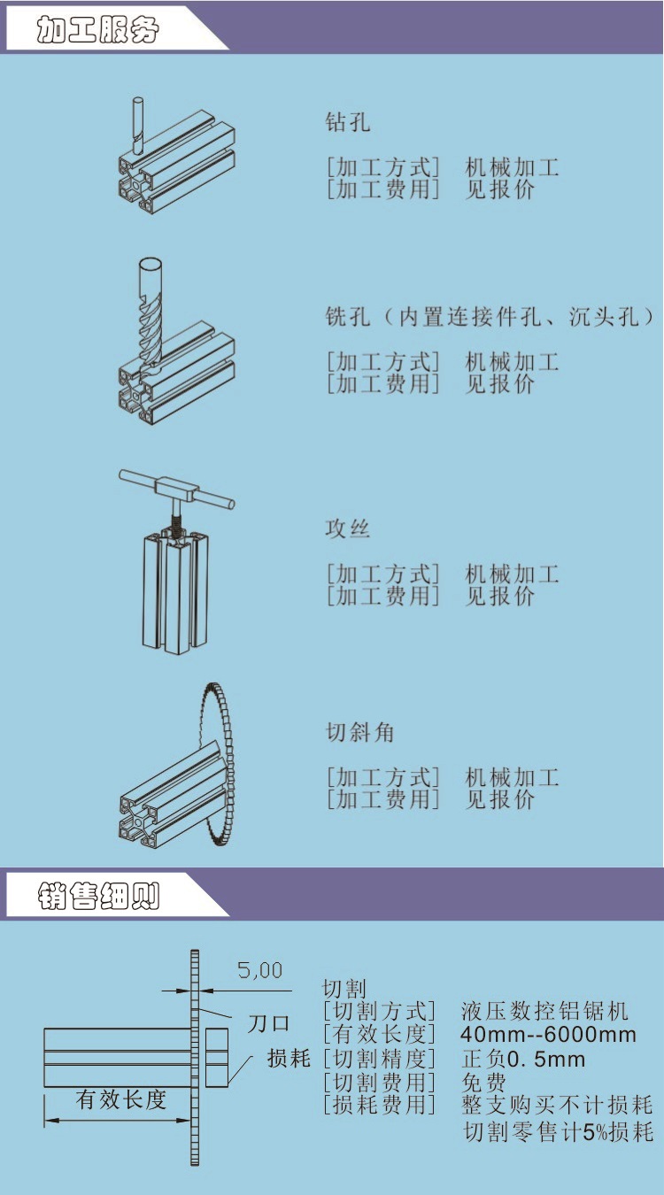 4、所有型材均可以按照图纸进行钻孔、攻螺纹、组装等加工,需要收取相应的费用。